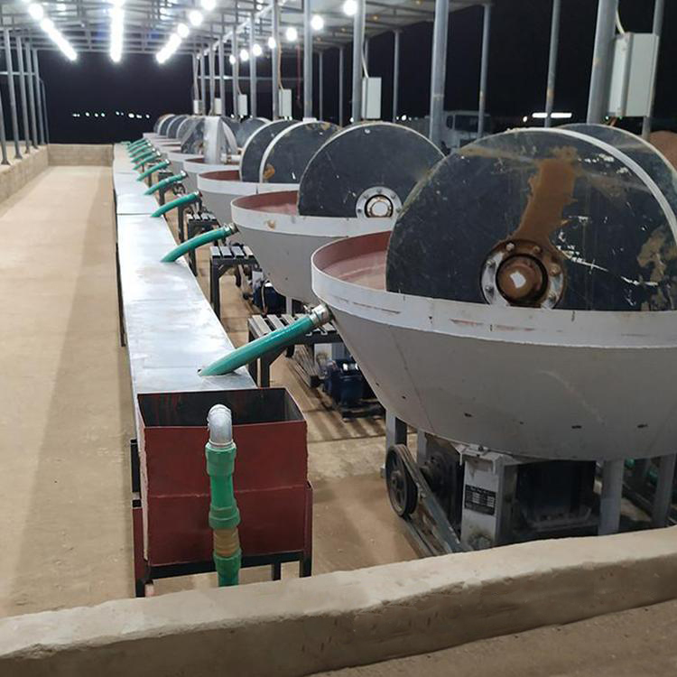 輪碾機(jī)由動(dòng)力裝置、機(jī)架、水盆、碾輪、碾盤等部件組成,采用輪動(dòng)式磨礦工作方式:理想電動(dòng)機(jī)將動(dòng)力傳動(dòng)至減速機(jī),在減速機(jī)帶動(dòng)下,通過大立軸將力矩傳遞給上方的橫軸,然后經(jīng)安裝在橫軸兩端的拉桿傳遞至碾輪,使碾輪產(chǎn)生驅(qū)動(dòng)力,沿橫軸水平方向做逆時(shí)針旋轉(zhuǎn)運(yùn)動(dòng);工作時(shí)的碾輪既能圍繞濕碾機(jī)大立軸公轉(zhuǎn),又能圍繞碾輪中心軸進(jìn)行自轉(zhuǎn),碾盤則固定不動(dòng)。添加的礦石物料,在碾磨機(jī)內(nèi)受到來自,碾輪自身重量帶來的擠壓力,碾輪公轉(zhuǎn)自轉(zhuǎn)時(shí)與碾盤產(chǎn)生的巨大摩擦力,在受到反復(fù)的擠壓、揉搓、研磨后,被粉碎。